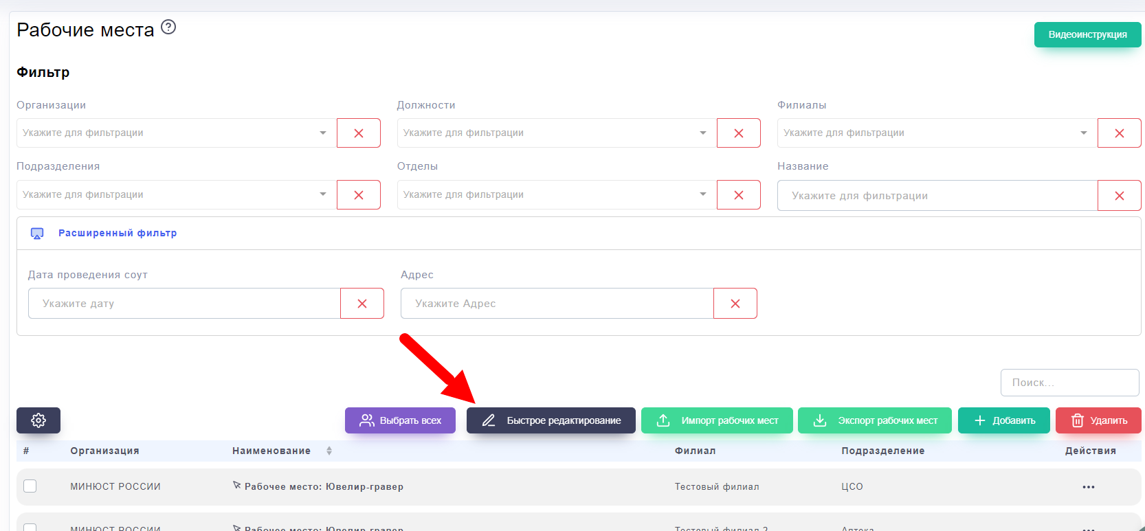 Так же в таблице представлены кнопки напротив каждой записи, с действиями, которые можно совершить с карточкой рабочего места.