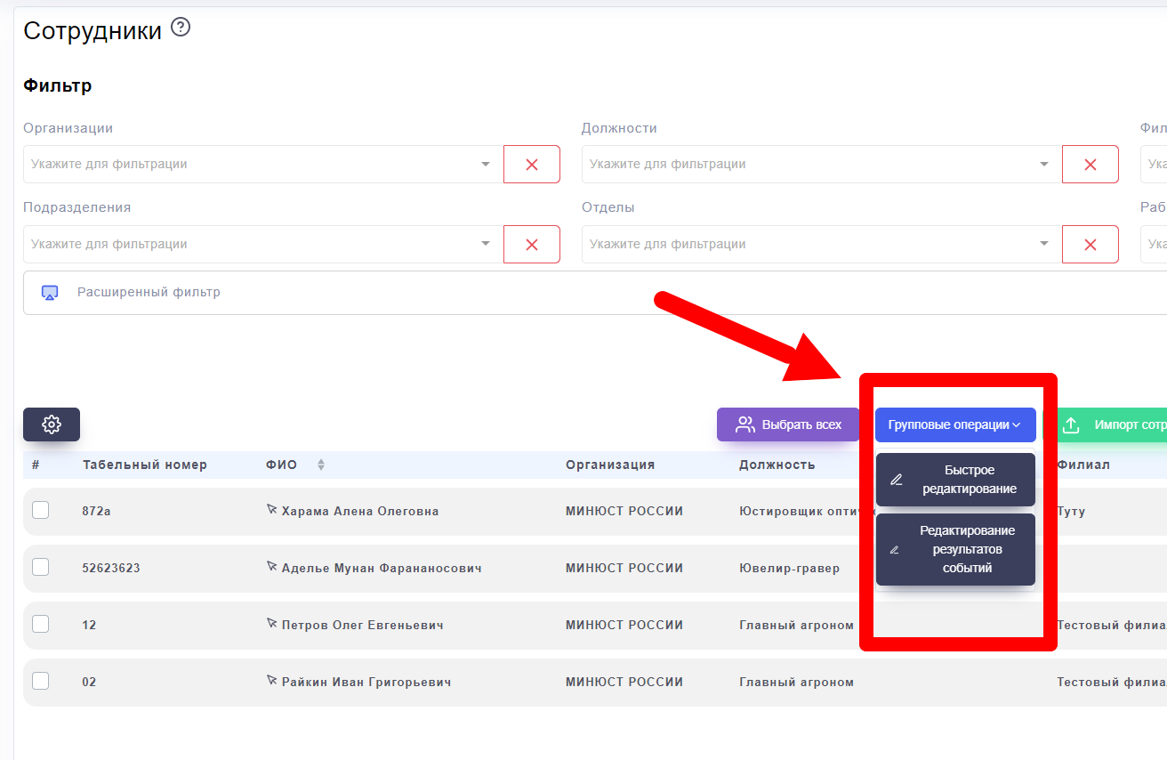 Так же в таблице представлены кнопки напротив каждой записи, с действиями, которые можно совершить с карточкой сотрудника.