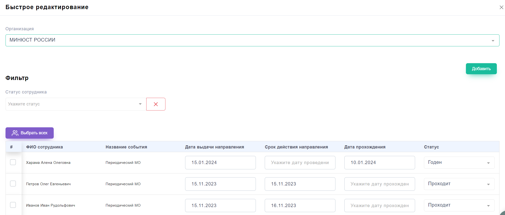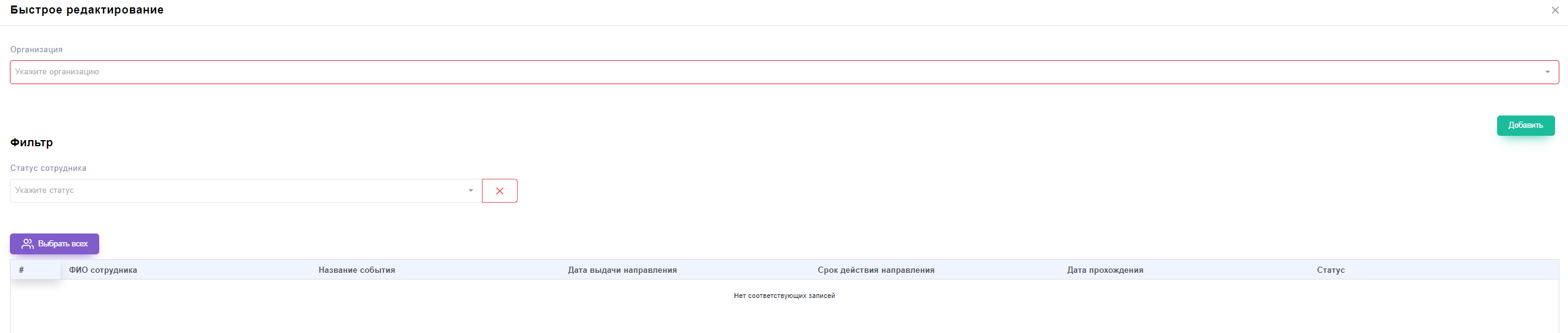Функционал "Быстрое редактирование" позволяет редактировать направления сотрудников на медицинский осмотр.