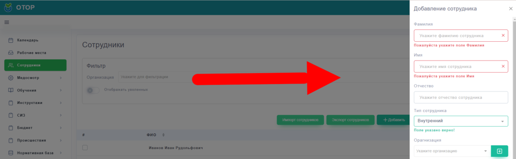 Для того, чтобы добавить нового сотрудника, необходимо нажать на кнопку "Добавить" После чего, в правой части экрана, откроется дополнительно окно для ввода данных: