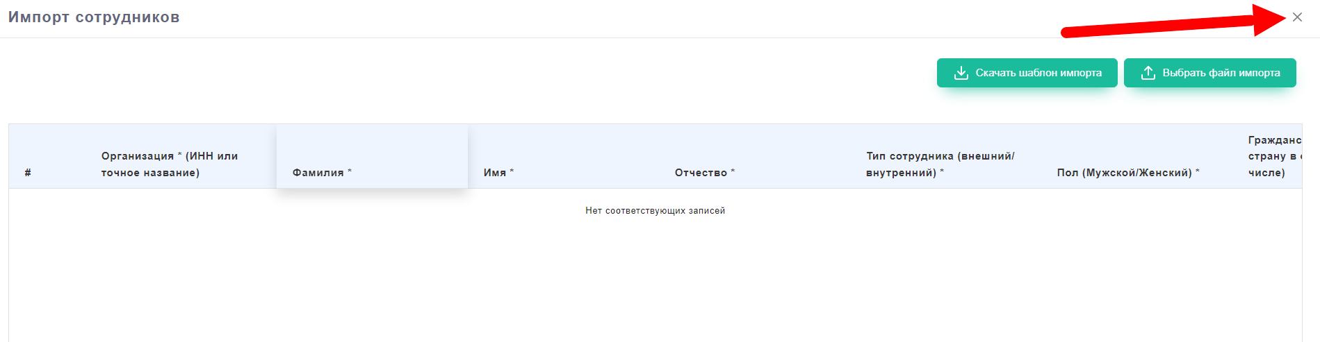 Для того, чтобы произвести импорт сотрудников необходимо нажать на кнопку "Импорт сотрудников"