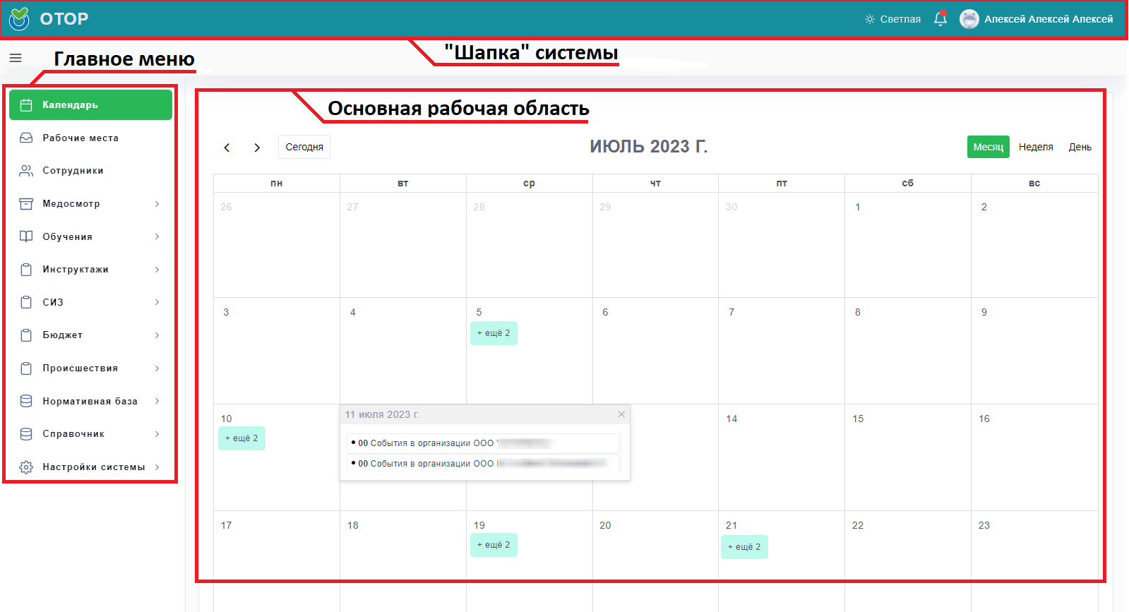 Основная рабочая область - наполнение основной рабочей области зависит от того, в каком блоке находится пользователь.