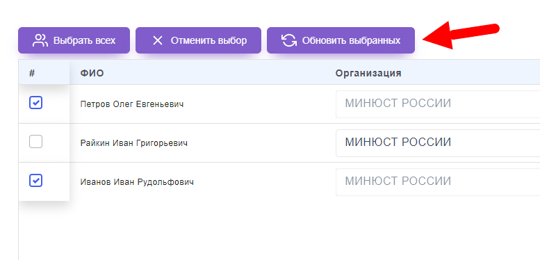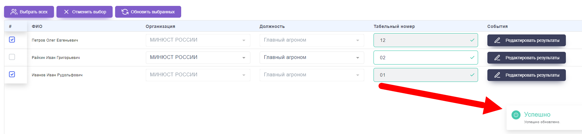 После нажатия на кнопку "Обновить выбранных", данные по ранее выбранным событиям отредактируются и в правой нижней части экрана появится уведомление об успешном обновлении данных