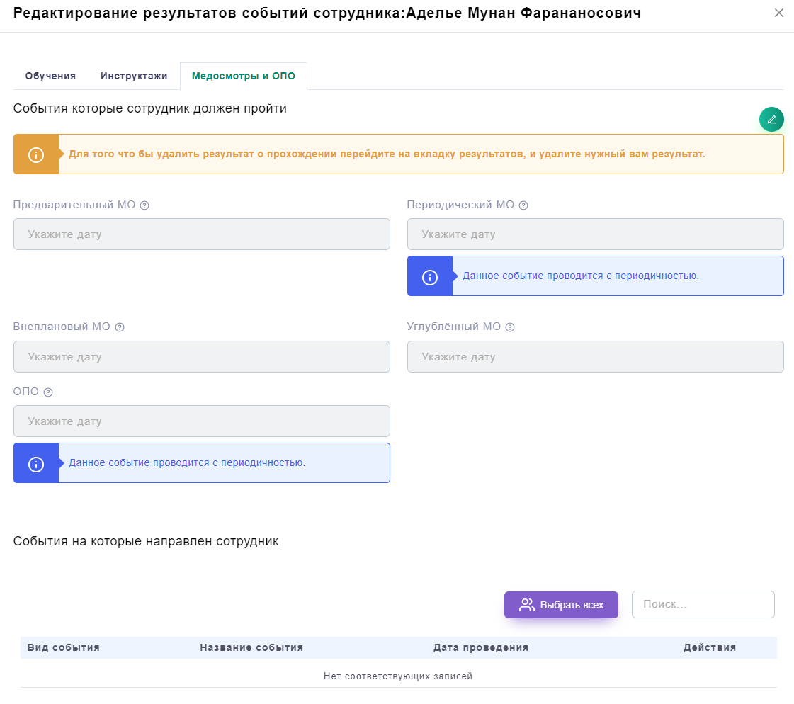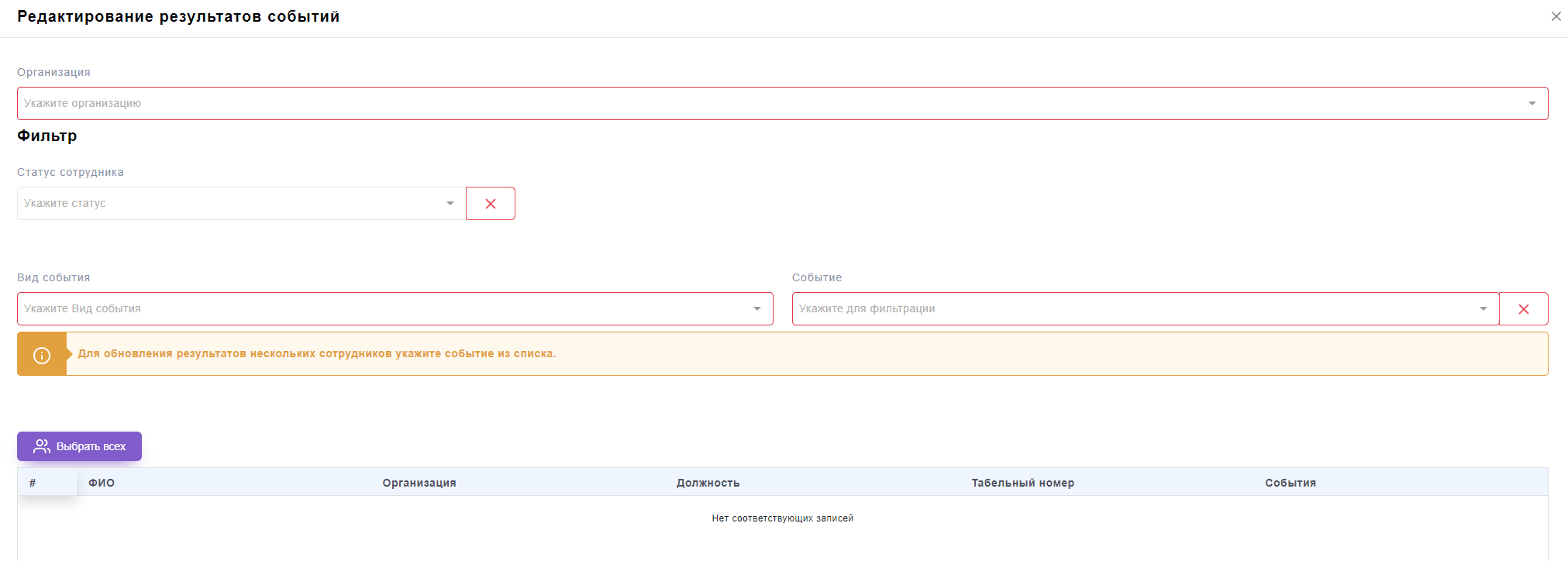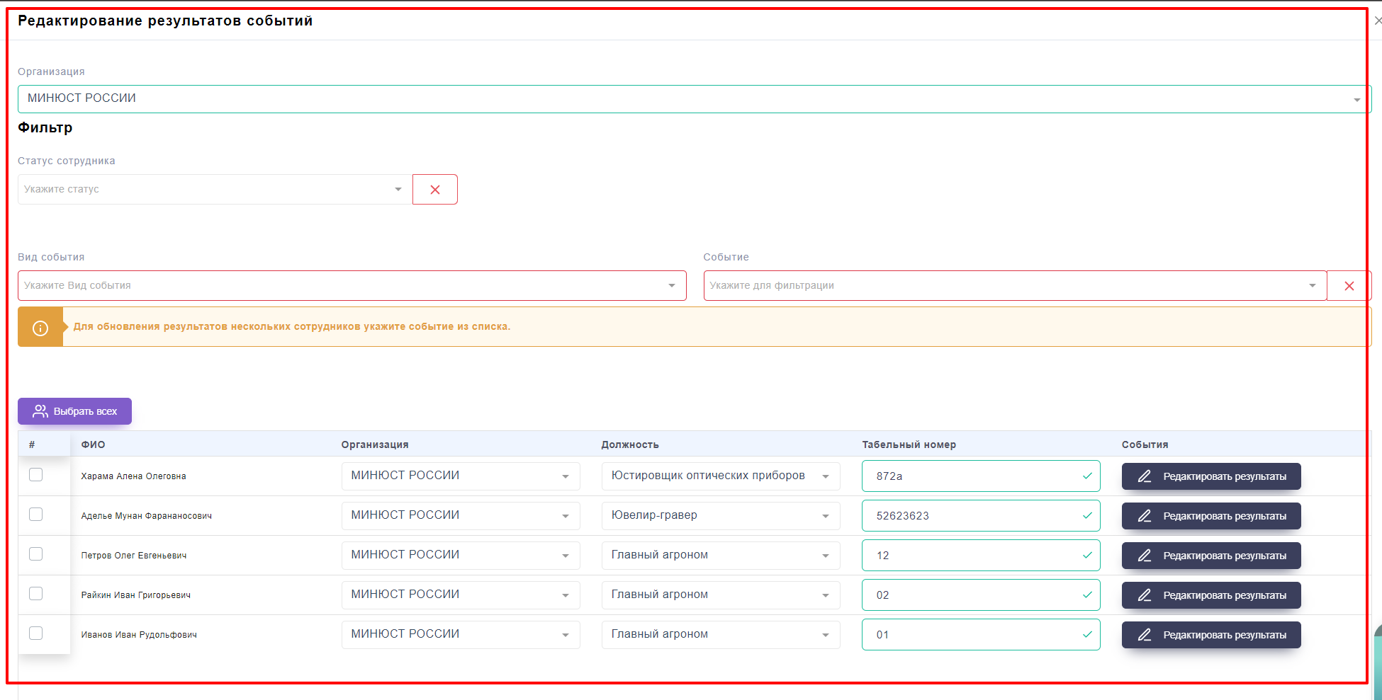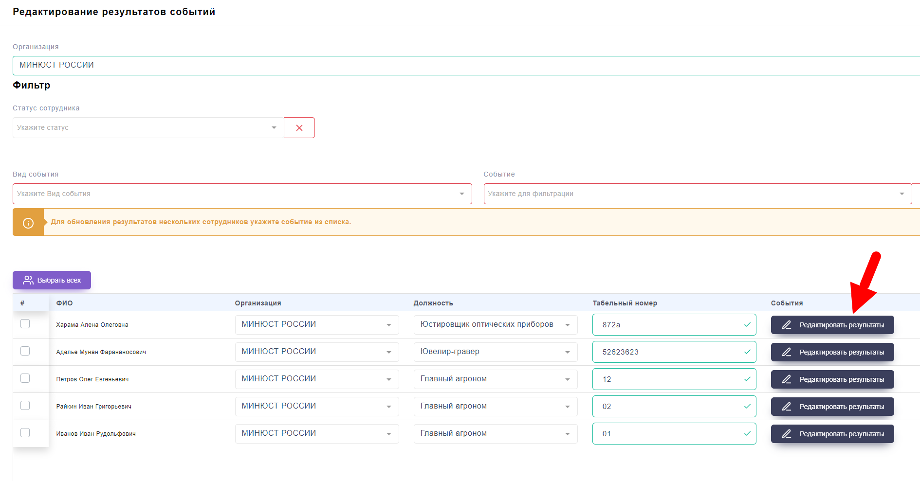 Функционал "Редактирование результатов событий" позволяет редактировать данные о событиях сотрудников.