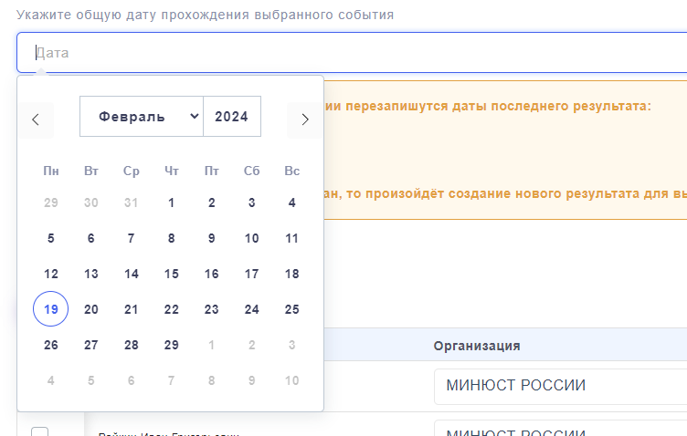 Для начала, необходимо выбрать интересующую организацию, в которой будет производиться редактирование результатов событий сотрудников, после чего, в списке ниже, появятся все сотрудники относящиеся к выбранной организации