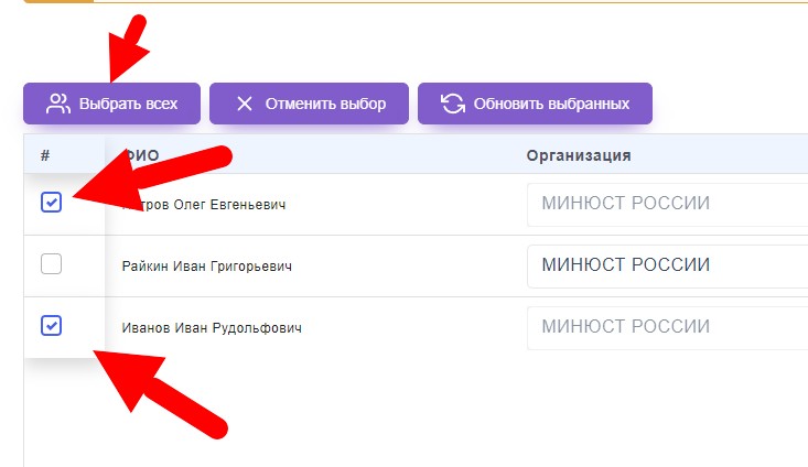 Указав все необходимые параметры, выбираем конкретных людей, которым хотим отредактировать событие или нажимаем кнопку "Выбрать всех", если хотим выбрать всех сотрудников из списка.